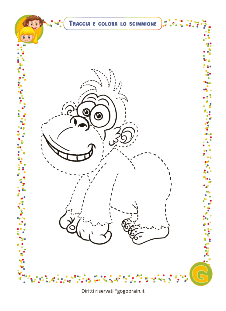 Prendi una matita e segui la linea tratteggiata, poi colora la figura. … Continua about Traccia e colora la scimmietta