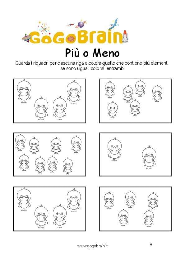 Guarda i riquadri per ciascuna riga e colora quello che contiene più elementi, se sono uguali colorali entrambi. … Continua about Colora le papere più numerose-Scheda n. 09
