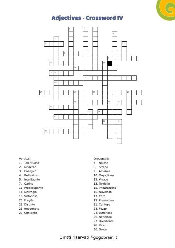 Quarto cruciverba degli aggettivi più comuni della lingua inglese. Segui le definizioni per identificare i più comuni aggettivi inglesi come … Continua about Cruciverba dei più comuni aggettivi in inglese – Scheda IV