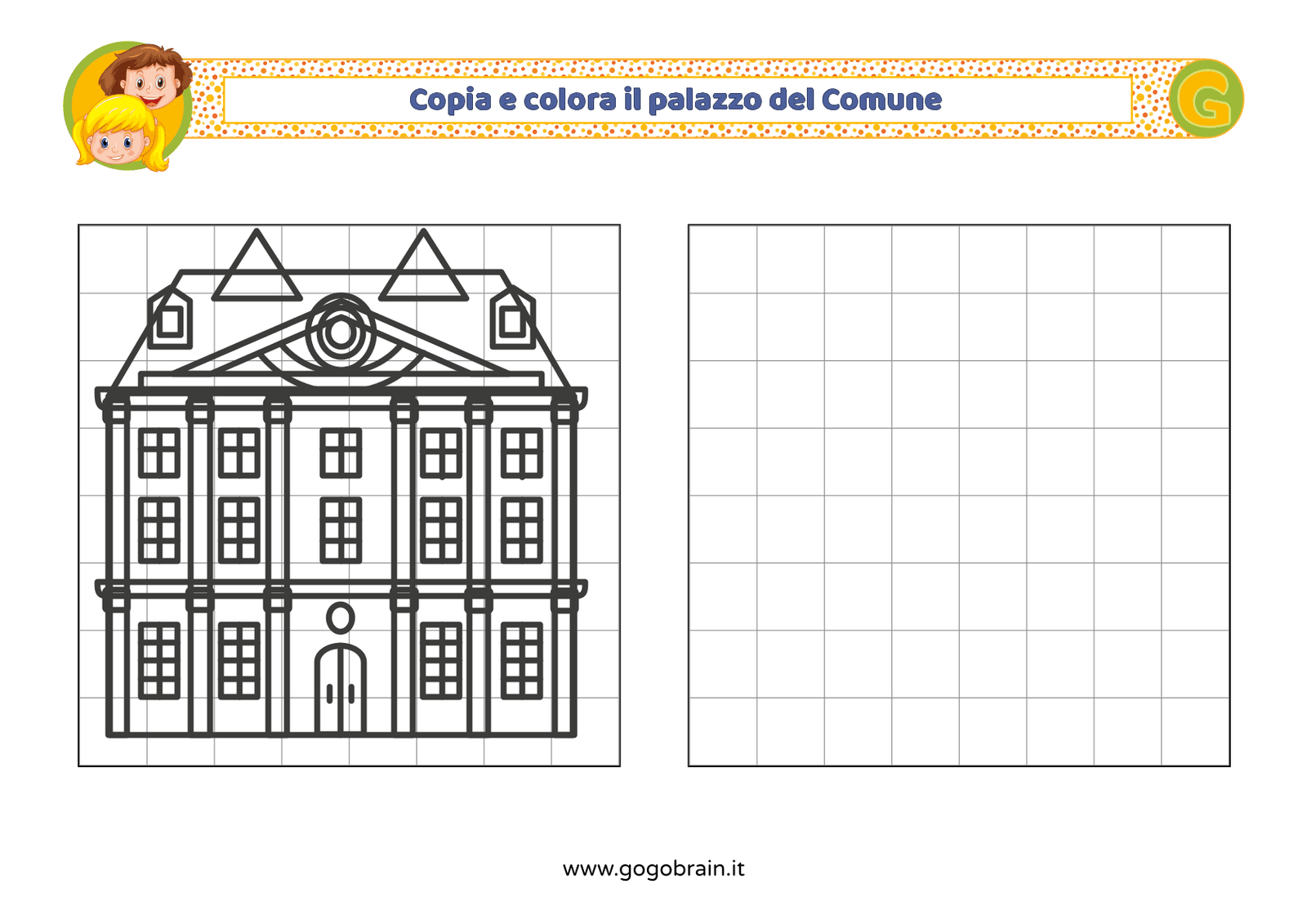Con l'aiuto dei quadretti copia la figura di sinistra e poi colorala a tuo piacere. … Continua about Copia e colora il palazzo del Comune