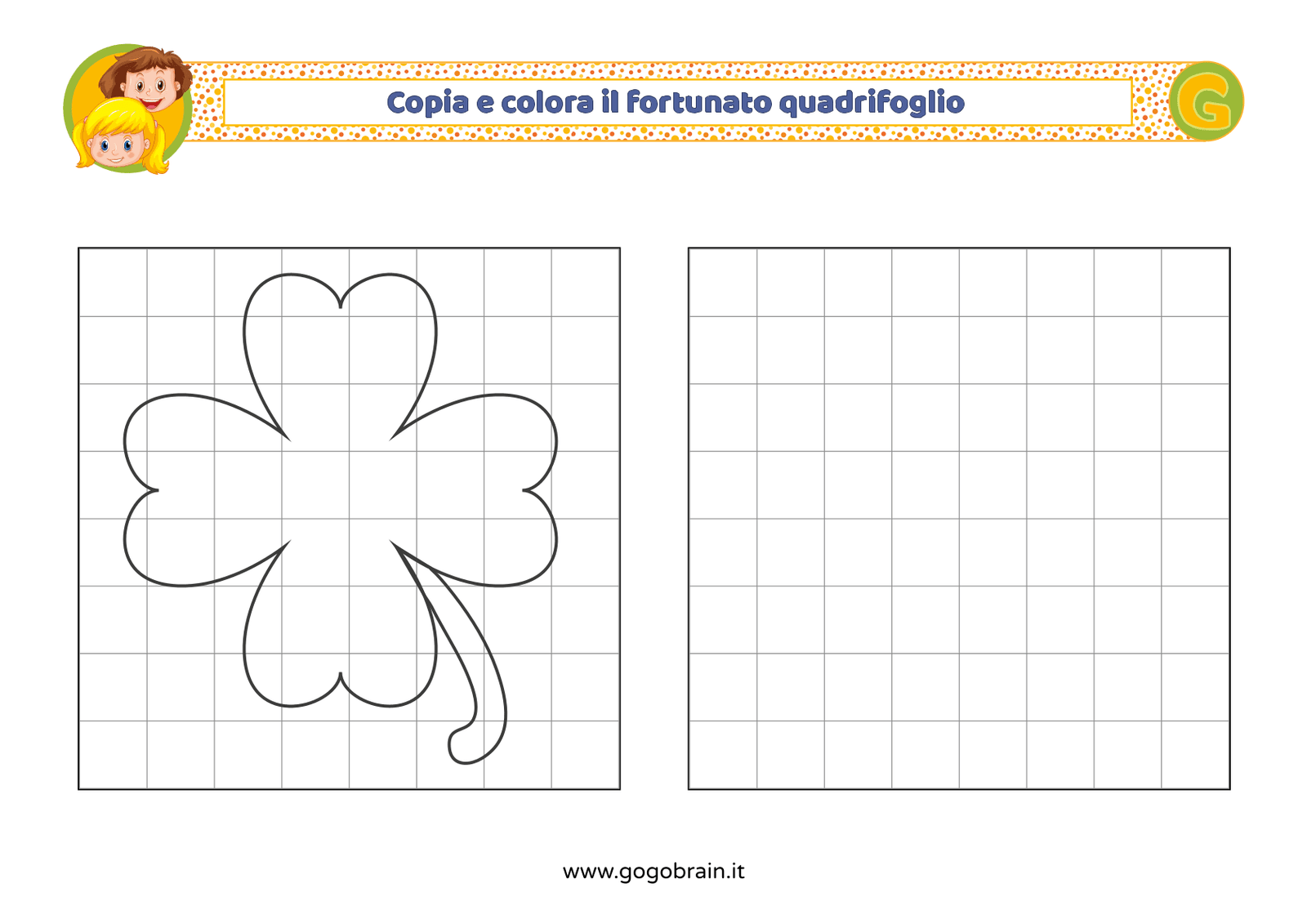Con l'aiuto dei quadretti copia la figura di sinistra e poi colorala a tuo piacere. … Continua about Copia e colora il fortunato quadrifoglio