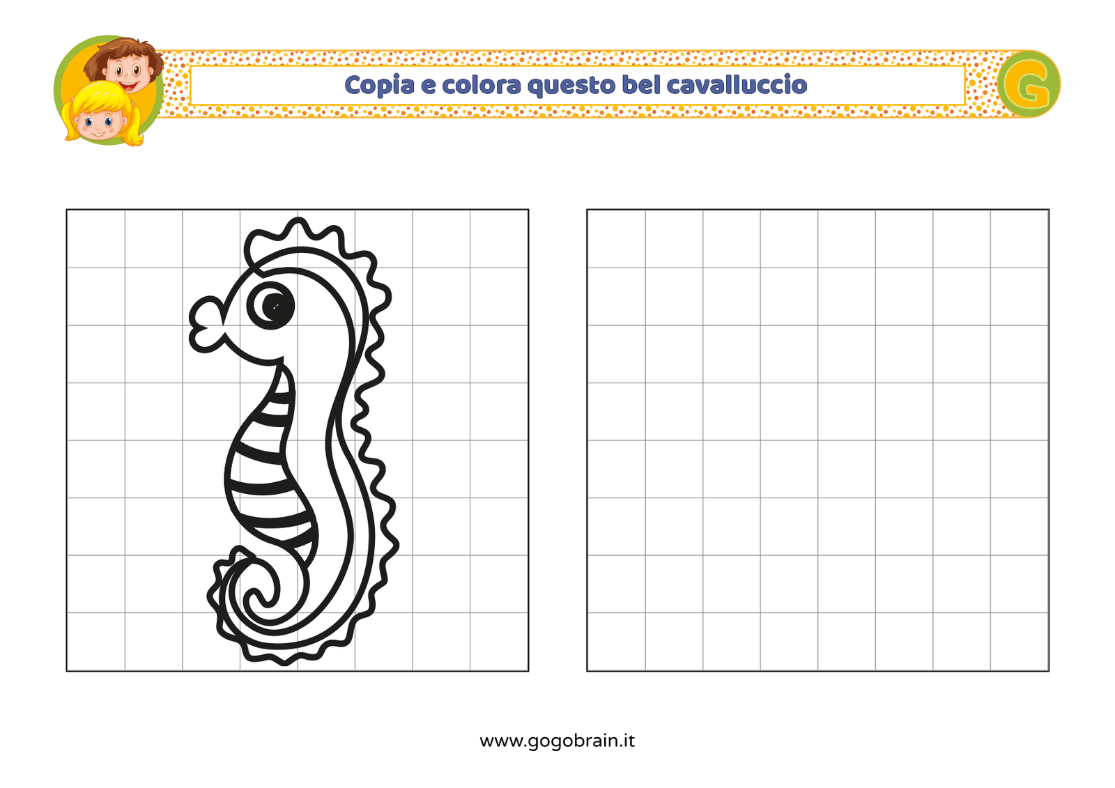 Con l'aiuto dei quadretti copia la figura di sinistra e poi colorala a tuo piacere. … Continua about Copia e colora il cavalluccio marino
