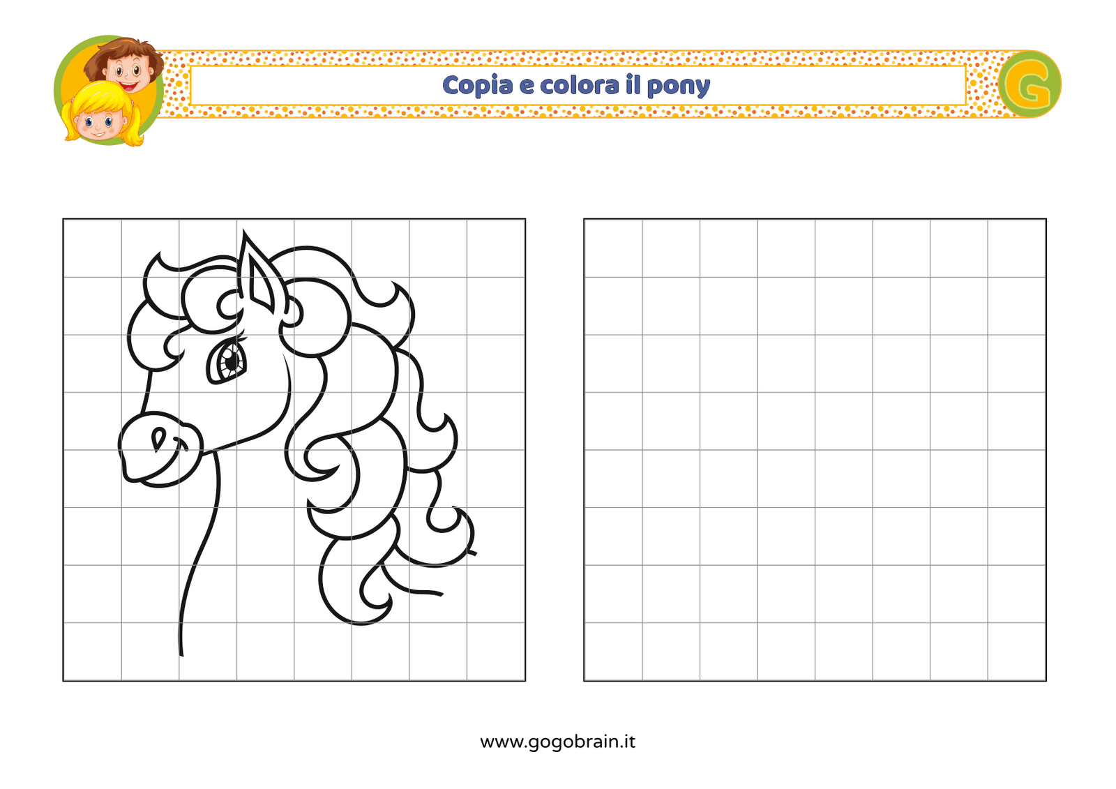 Con l'aiuto dei quadretti copia la figura di sinistra e poi colorala a tuo piacere. … Continua about Copia e colora il pony