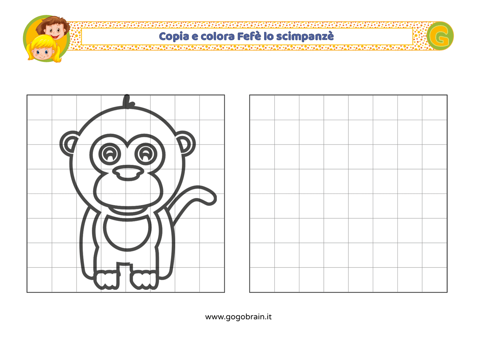 Con l'aiuto dei quadretti copia la figura di sinistra e poi colorala a tuo piacere. … Continua about Copia e colora Fefè lo scimpanzè