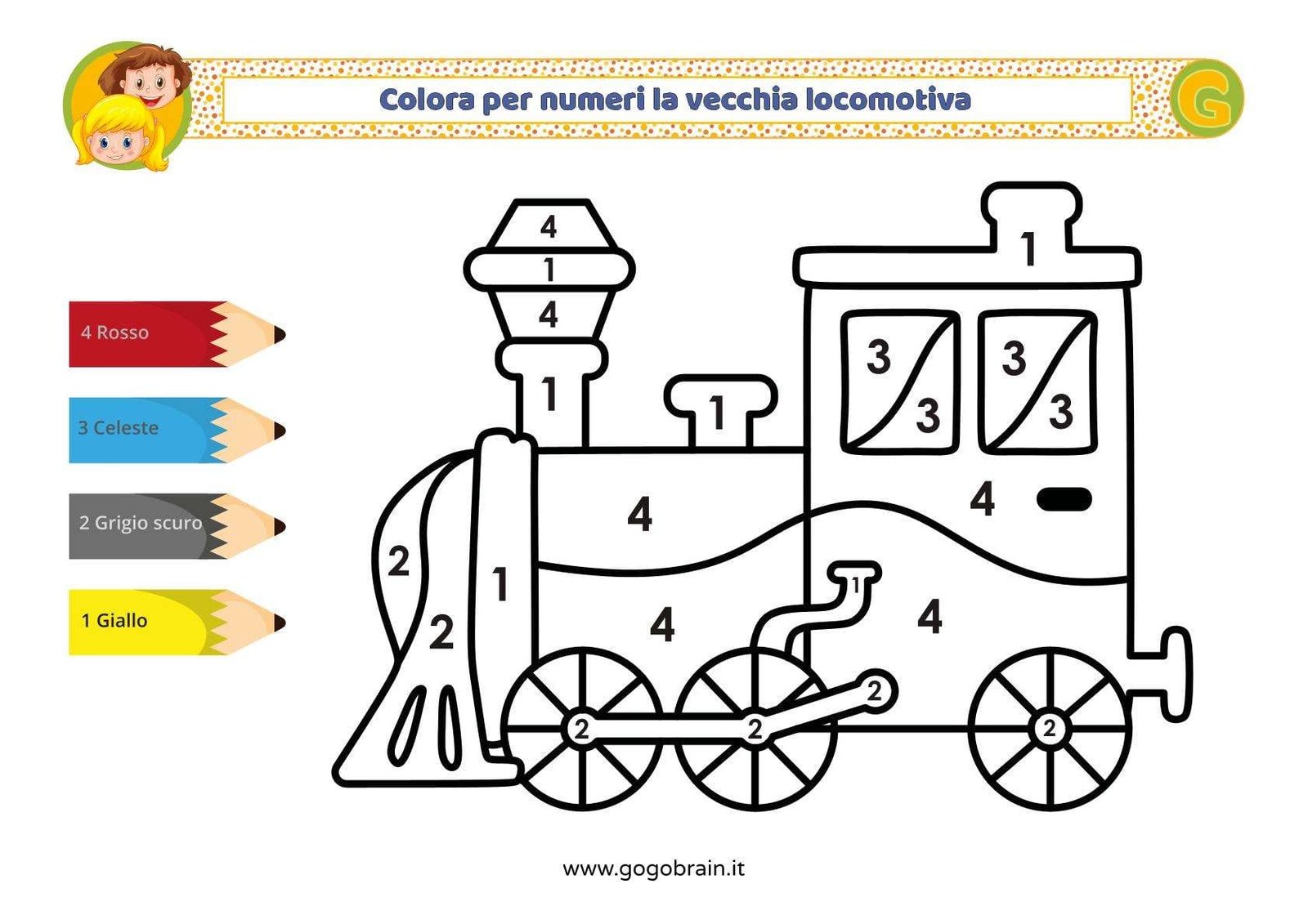 Ad ogni porzione corrisponde un numero e ad ogni numero corrisponde un colore. Passo dopo passo la locomotiva prenderà colore. … Continua about Colora per numeri la locomotiva