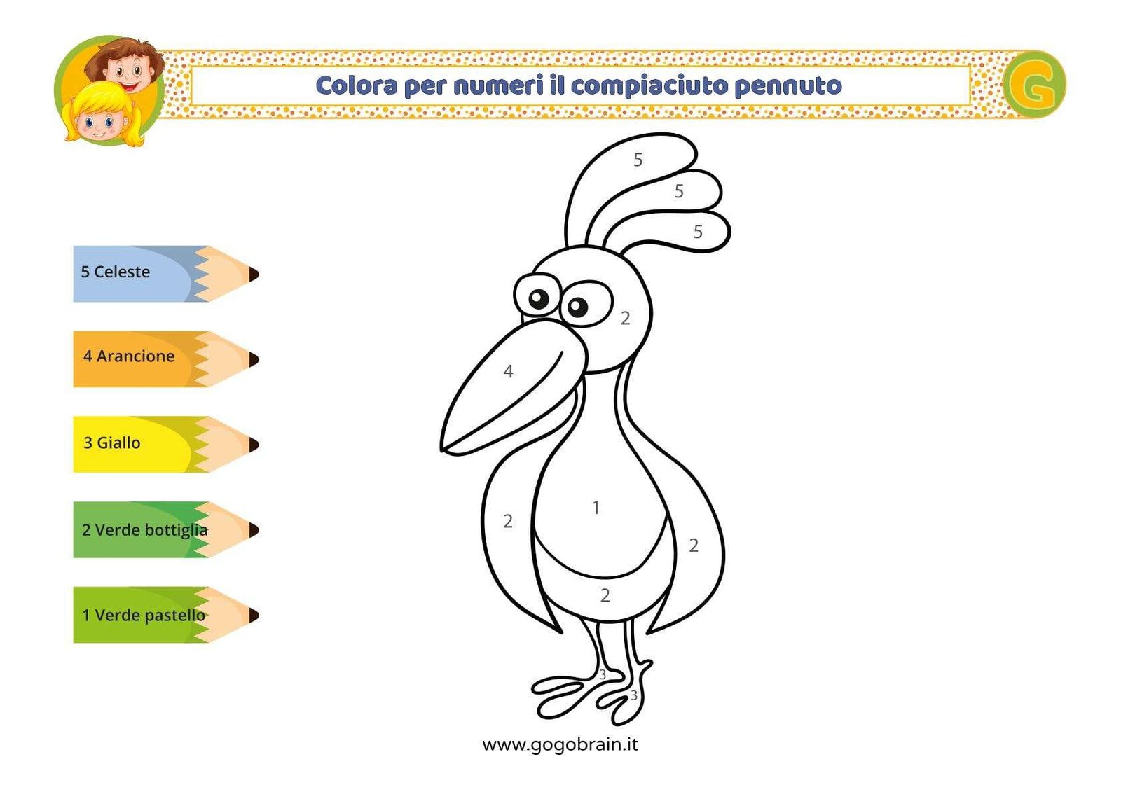 Ad ogni porzione corrisponde un numero e ad ogni numero corrisponde un colore. Passo dopo passo il compiaciuto pennuto prenderà colore. … Continua about Colora per numeri il compiaciuto pennuto