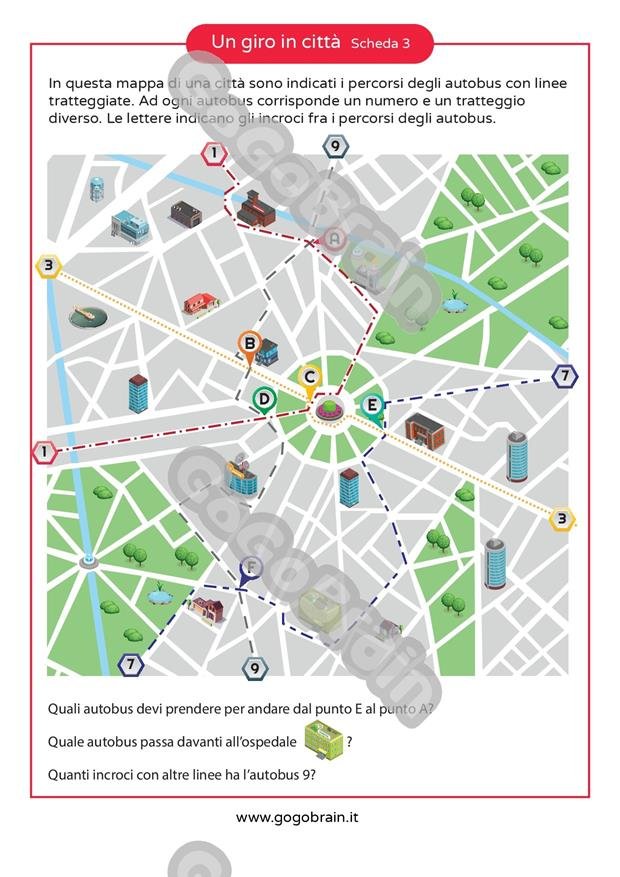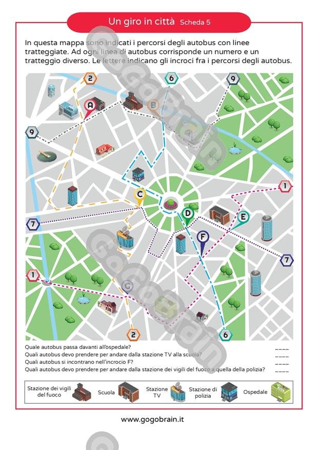 In queste mappe sono indicati i percorsi degli autobus con linee tratteggiate. Ad ogni autobus corrisponde un numero e un tratteggio diverso. Le lettere indicano gli incroci fra i percorsi degli autobus. I bambini devono rispondere ad alcune domande di orientamento e comprensione di una mappa. Ad esempio: quale numero d’autobus devi prendere per andare dal punto E a punto B? Oppure quale autobus passa davanti alla stazione di polizia?